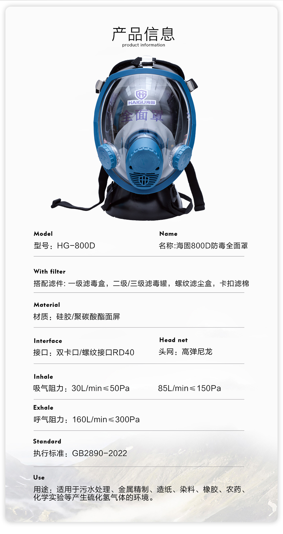 海固800D全面罩+HG-ABS/P-H2S-2濾毒罐 硫化氫氣體防護套裝